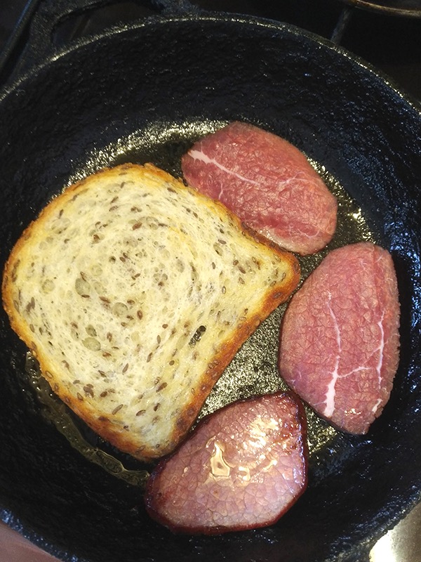 1. Обжариваем хлеб с двух сторон. Можно вместе с беконом.