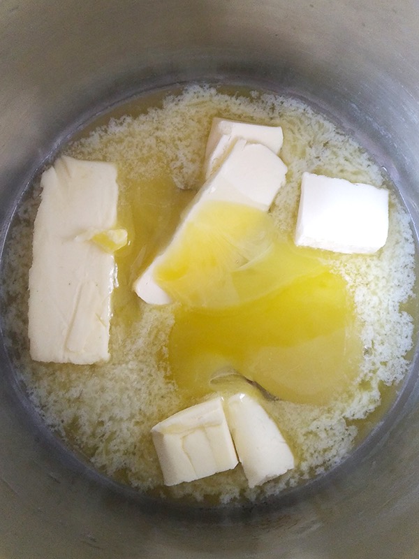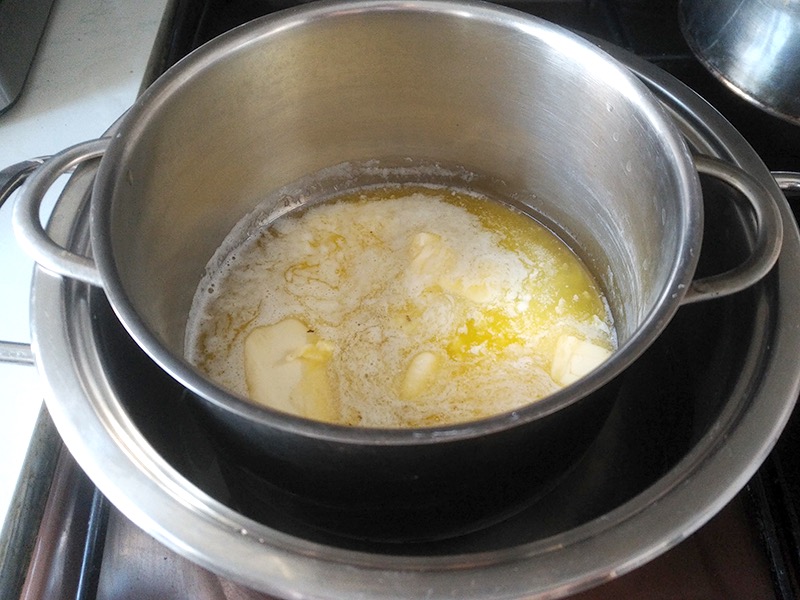 4. Вода в основной кастрюле нагревается, в емкость с желтками добавляем порезанное и мягкое сливочное масло. Перемешиваем и ждем, пока масло полностью растворится.