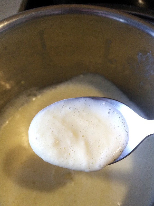 5. Помешиваем и ждем, пока масса загустеет. Желтки должны полностью смешаться с маслом. Вы не должны видеть комочки «вареного» желтка. Если такое появилось, зафиксируйте на будущее: вода должна быть не такой горячей, чтобы не позвонить желтку затвердеть раньше времени. Чтобы избежать отделения желтка, можно периодически приподнимать кастрюльку с соусом из воды. Так смесь не перегреется.