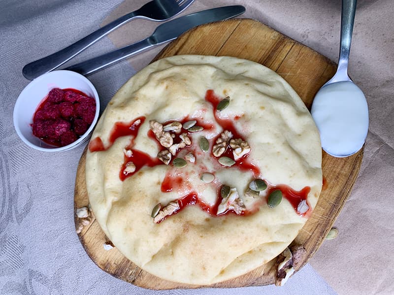 Чачоха – как и панкейк – отличная основа для комбинированного завтрака. Можно полить медом. Орехами и сухофруктами. Можно положить варенье со сметаной. Можно совсем модно подать: со сливочным сыром и красной рыбой. Или авокадо и зелень. Фантазируйте!