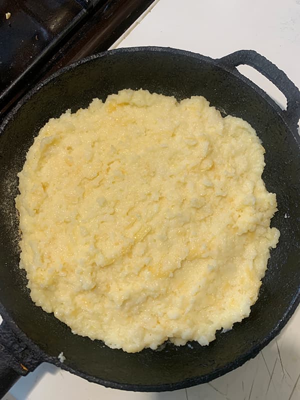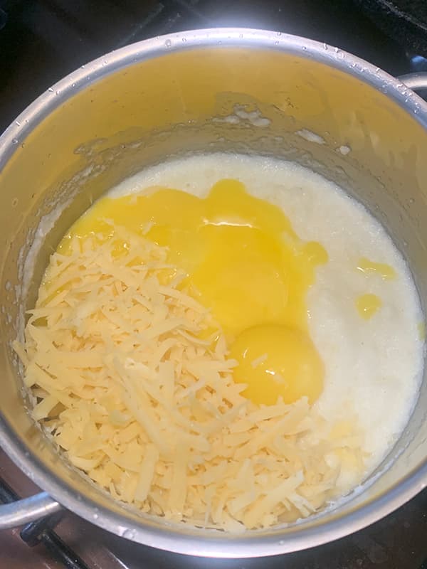6. Когда каша будет готова и немного остынет, вбить желтки всех яиц и вложить сыр. Все сильно разбить в однородную массу. Хороший помощник в этом миксер.