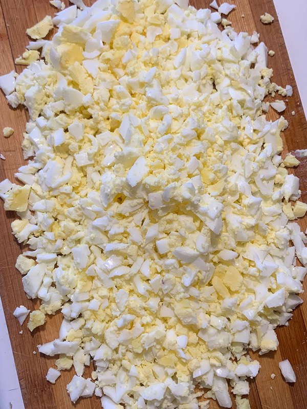 1. Сварить вкрутую 5 яиц. Почистить и мелко нарезать. Это будет наше «мясо».