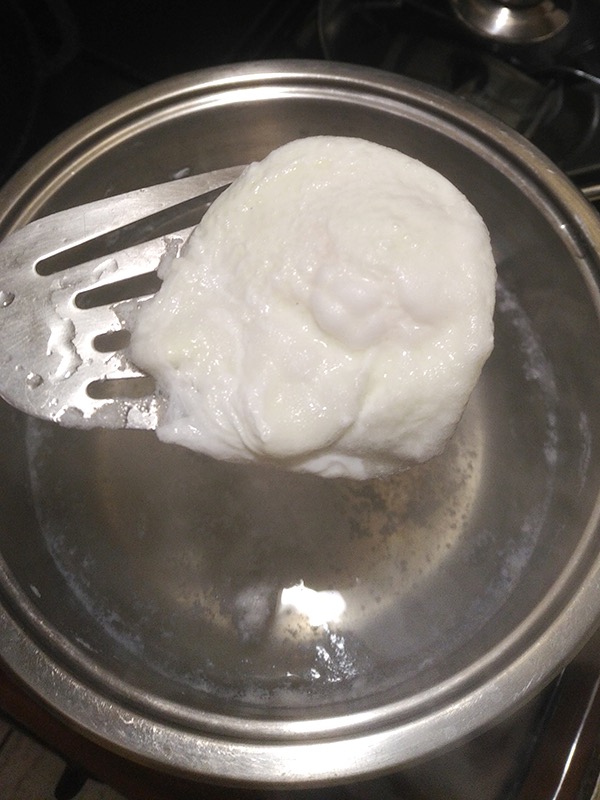 6. Белок может пустить «стрелки» по кастрюле. Обычная история. Столовой ложкой подгребите кусочки к центру яйца (третий нюанс). Действуйте смело, загребайте, как минивеслом.