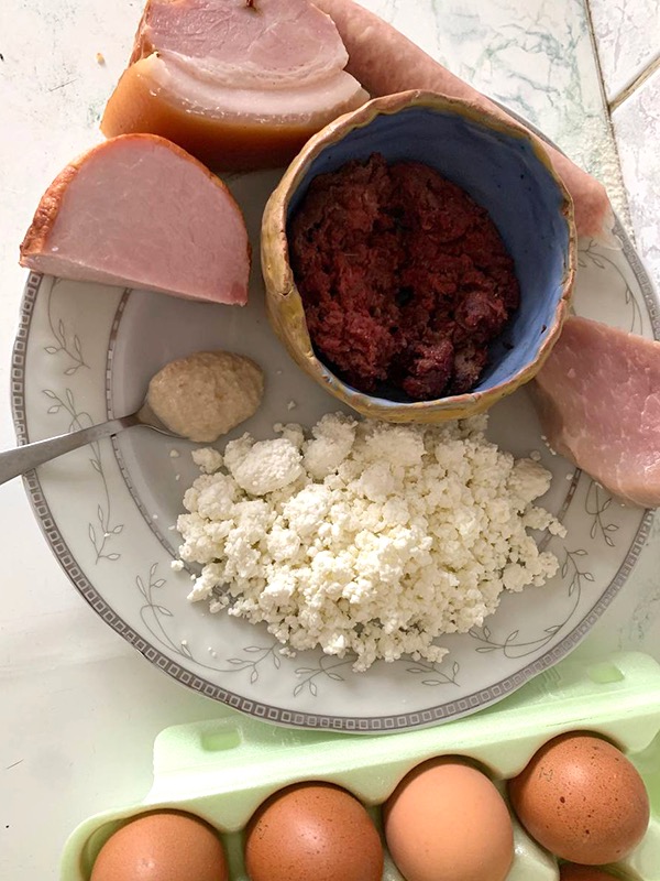 Яичница с хреном не новость. Встречается необычное сочетание продуктов в рецептах яичницы Полесья (украинском и белорусском), а также в яичнице по-словацки. Правда, в последнем варианте нет мяса, творога. Лишь яйца, хрен, белая булка, соль и сливочное масло. Тоже вкусно. Но вернемся к пасхальной яичнице. У нас сегодня на столе будет много мяса!