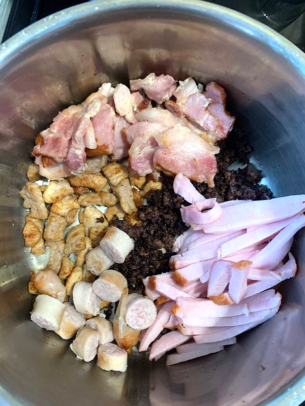 7. Отдельно обжарить сырую свинину до мягкости. Соединить с грудинкой и хреном. Удобно это делать в кастрюле (а не сковороде). Туда же добавить остальные мясные продукты.