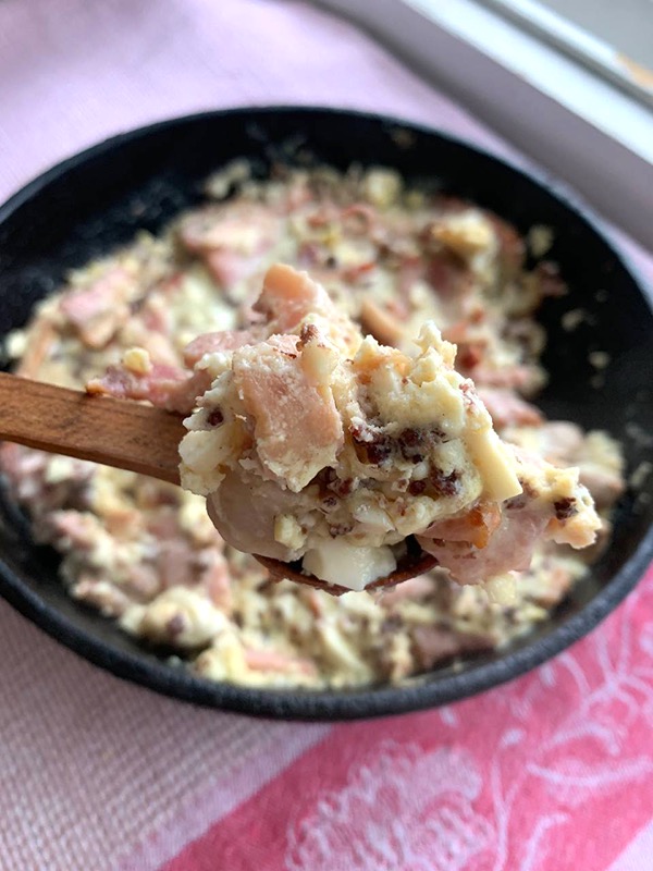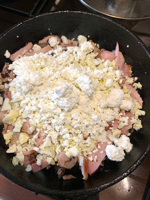 Изобилие мяса в составе не единственная особенность пасхальной яичницы. Вместе с кусочками тушеного мяса, грудинки, колбас и любых других изделий из мяса, которые собрали с праздничного стола, в блюдо идут творог и хрен.