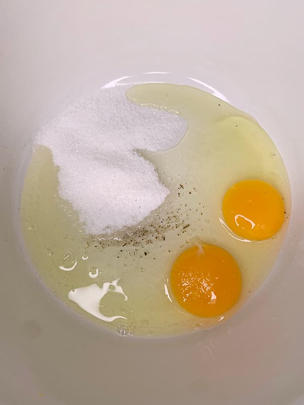 1. Перемешать в миске яйца, соль, сахар, кефир.