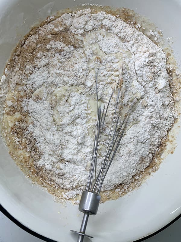 3. Добавить к смеси из яиц и кефира пшеничную муку и гречневую.