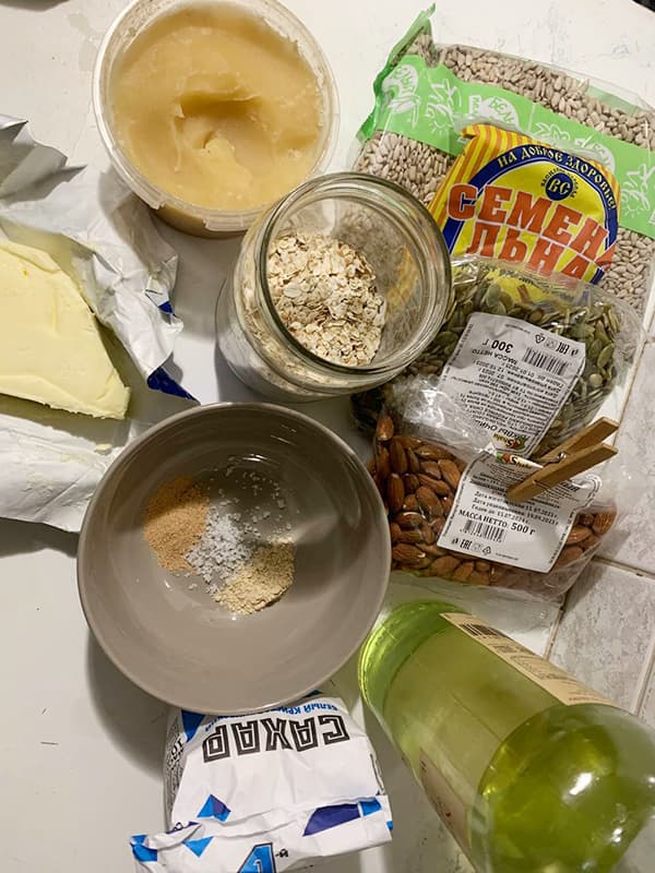 В состав гранолы может входить любой орех. Мы добавляем семечки (подсолнечника, тыквенные) и семя (чиа, льна). Из сухофруктов самые популярные – финики и изюм. Их в гранолу кладут в конце готовки. Это важно помнить, так как сухофрукты сгорят, если их положить сразу.