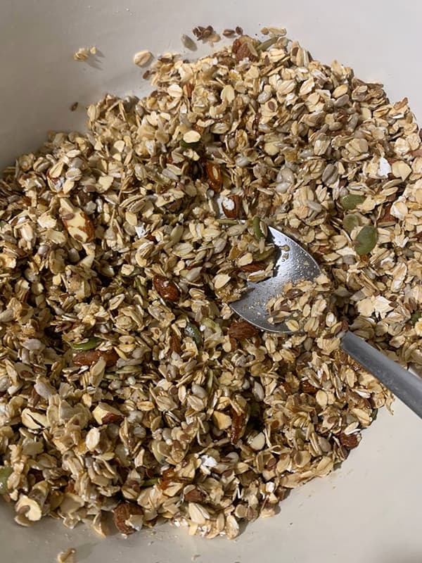 7. Сухофрукты измельчить и добавить, когда достали гранолу. Все перемешать. Дать остыть.