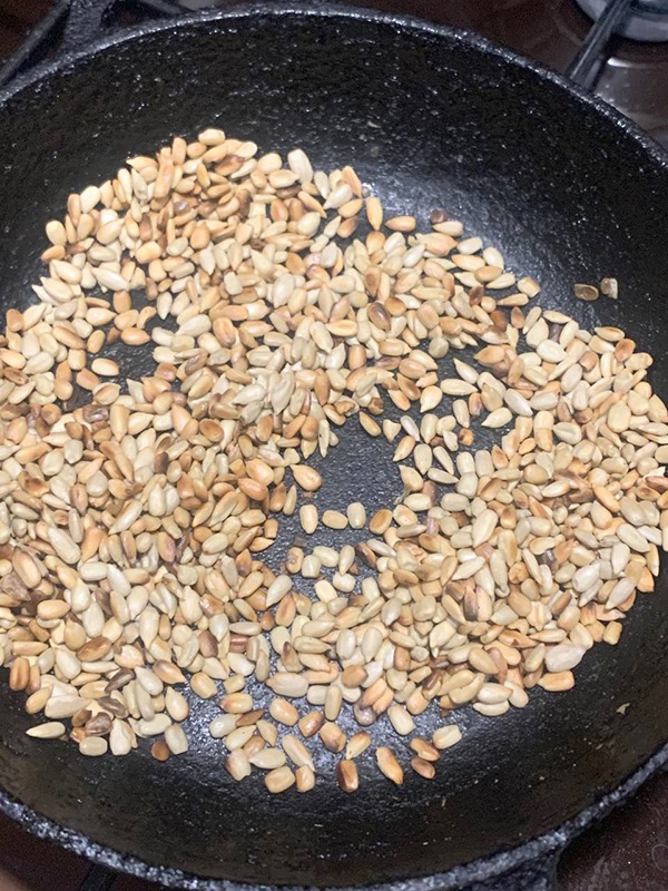 4. Кедровые орешки или семечки обжарить на сухой раскаленной сковороде. Порубить ножом.