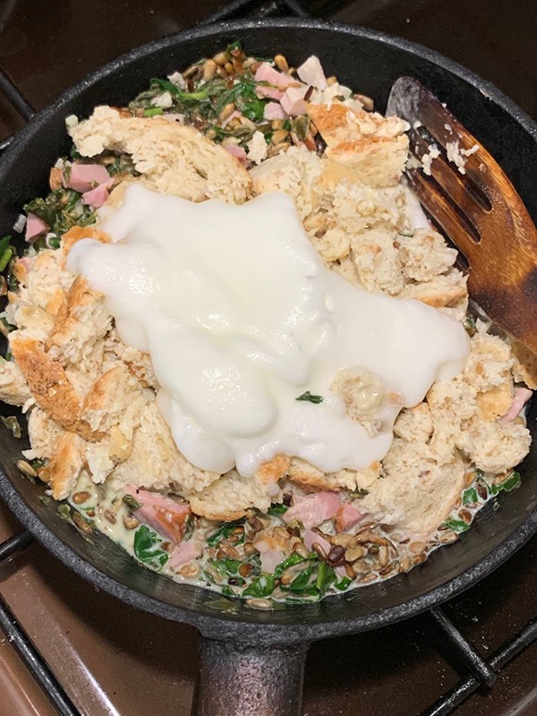 7. Смешать шпинат, грудинку, булку, соль, перец, чеснок и орехи или семечки.