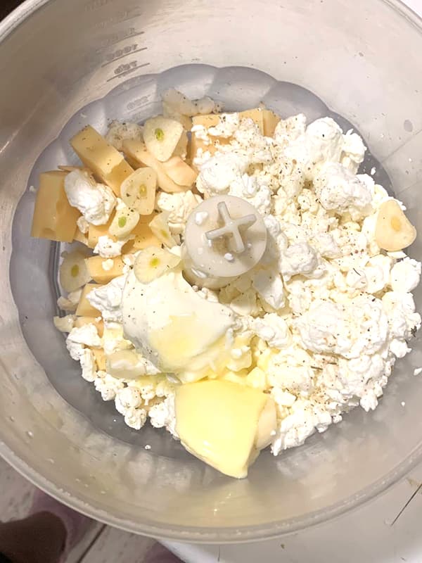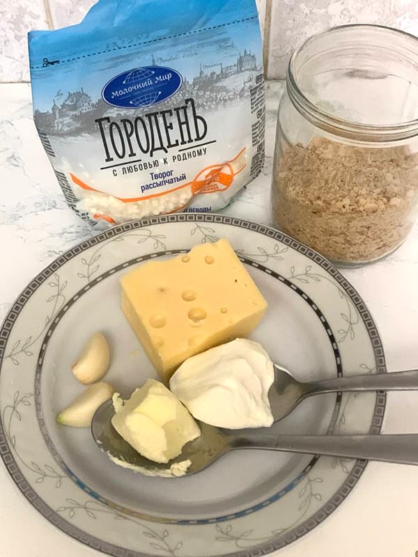 1. Взбить в блендере куски сыра, творог, чеснок, мягкое сливочное масло, соль, перец, сметану или майонез. Если нет блендера, потереть чеснок и сыр на самой мелкой терке и перемешать с остальными ингредиентами.